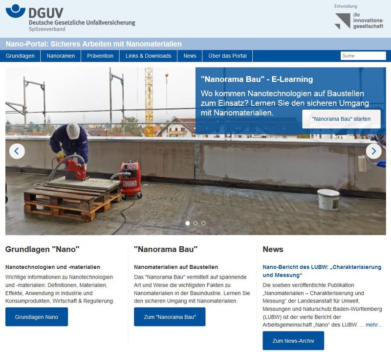 Die Deutsche Gesetzliche Unfallversicherung (DGUV) hat ein Arbeitsschutz-Portal zu Nanomaterialien veröffentlicht. Das Portal "Sicheres Arbeiten mit Nanomaterialien" ist im Internet unter http://nano.dguv.de erreichbar. Es bietet aktuelle Informationen zur Arbeitssicherheit und neuartige, interaktive E-Learning Tools, die "Nanoramen". Das Nano-Portal ist damit das weltweit erste interaktive Portal zum Arbeitsschutz beim Umgang mit Nanomaterialien. Es richtet sich sowohl an Präventionsfachleute als auch Beschäftigte ohne Fachkenntnisse in der Nanotechnologie. Das Portal wurde im Rahmen eines von der DGUV unterstützten Projekts von der Innovationsgesellschaft, St. Gallen entwickelt.