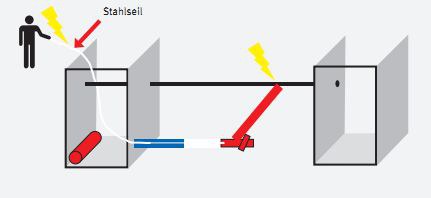 Durch die Wasserleitung aus Stahl, die Erdrakete, das Nachführseil aus Stahl und den im Kopfloch auf Erdpotenzial stehenden