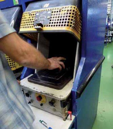 Ein scheinbar normaler Arbeitsschritt: Ein Mitarbeiter legt einen Schuh in die Aufnahmeplatte der Sohlenklebepresse und betätigt damit den Endschalter, der den Pressvorgang auslöst. Sekundenschnell korrigiert er noch einmal die Position des Schuhs. Wenn das Auflegen länger dauert, sorgt die voreilende Schutzhaube für eine Unterbrechung des Pressvorgangs. In diesem Fall lief alles anders.