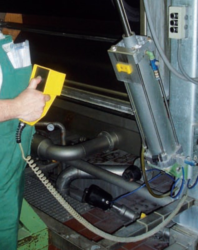- Bei geöffneter Verkleidung des Jiggers darf dieser nur im Kriechgang und mit einer Steuereinrichtung ohne Selbsthaltung (Totmannschalter) laufen. Dieser Totmannschalter kann hand- oder fußbetätigt sein. In einigen Betrieben hat sich ein kabelgebundener, beweglicher Taster als Vorteilhaft erwiesen.