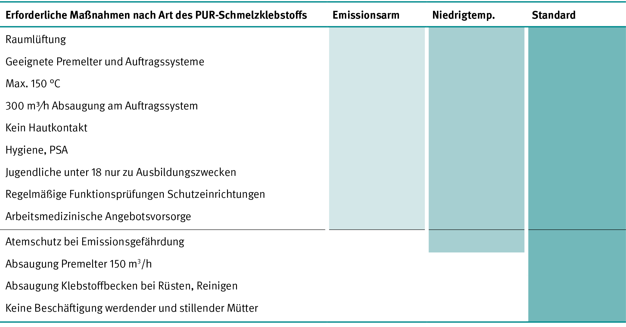 Ausführliche, konkrete Anforderungen für die Verarbeitung von PUR-Klebstoffen sind in der DGUV-Information 213-715 (BGI 790-15) "Verwendung von reaktiven PUR-Schmelzstoffen bei der Verarbeitung von Holz, Papier und Leder" zusammengestellt. Anhand einer Checkliste zur Gefährdungsbeurteilung können die Schutzmaßnahmen für die jeweils vorliegende Klebebindeanlage und den verwendeten Klebstoff ermittelt und überprüft werden. Die Gestaltung des Arbeitsplatzes entsprechend diesen Empfehlungen ermöglicht einen sicheren Umgang mit PUR-Schmelzklebstoffen.