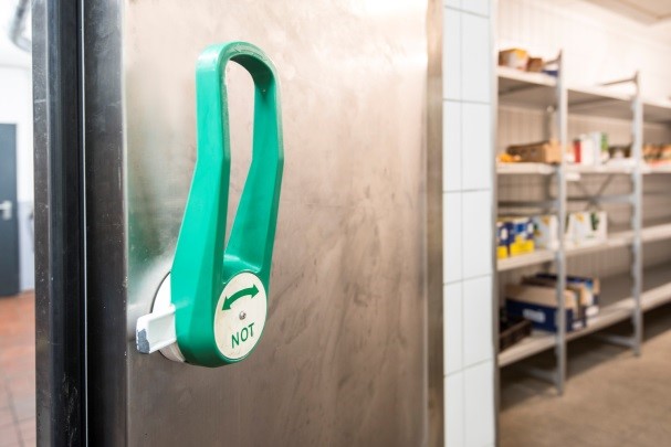 Ortsfeste begehbare Kühlräume mit einer Grundfläche von mehr als 10 m² müssen jederzeit verlassen werden können. Die Tür muss sich jederzeit von innen öffnen lassen. Der Notausgang muss auch bei Dunkelheit erkennbar sein. Hinweise zum Entriegeln der Tür sollten deutlich erkennbar und leicht verständlich von innen angegeben sein.