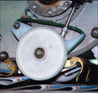 Das Zeitungstransportsystem ist ein Kettenförderer, der die in Greifklammern gefassten Zeitungen von der Druckmaschine in den Bereich Zeitungsweiterverarbeitung transportiert. Durch den Verschleiß der Kurvenelemente in der Aufnahmestation des Transportsystems entstand eine enorme Lärmbelastung für das Druckpersonal. Nach verschiedenen Tests entstand die heutige Lösung: In einer eingefrästen Nut ist ein Polycordriemen um das Kurvenelement gespannt. Dadurch ist die Lärmbelastung dauerhaft reduziert worden.