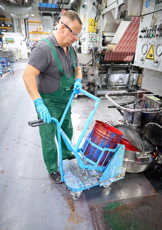 Auszeichnung: In Druckereien kann das Einfüllen schwerer Behälter mit Lack und Farbe bei Beschäftigten zu Rückenbeschwerden führen. Dieser ergonomische Handwagen verringert solche Risiken, indem er den benötigten Kraftaufwand auf ein Minimum reduziert.