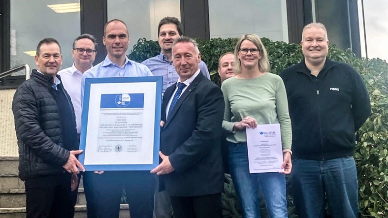 Im November 2022 hat die BG ETEM erstmals das betriebliche Arbeitsschutzmanagementsystem sowie die Bestätigung der Konformität zur DIN ISO 45001 der FIBRO GmbH begutachtet. Mit Erfolg: Das Foto zeigt die Übergabe des AMS-Zertifikats an Vertreter des Unternehmens, das an seinem Sitz in Weinsberg Normteile im Werkzeugbau herstellt.