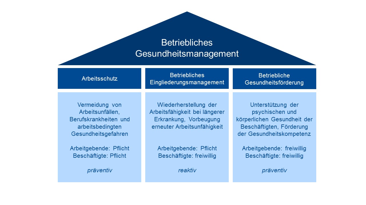 Das Betriebliche Gesundheitsmanagement umfasst den Arbeitsschutz, die Betriebliche Gesundheitsförderung (BGF) sowie das Betriebliche Eingliederungsmanagement (BEM). Es erfolgt eine Koordination mit Unternehmenspolitik, Personal- und Organisationsentwicklung. Mit dem BGM können die Produktivität sowie Wettbewerbsfähigkeit der Organisation erhöht werden.