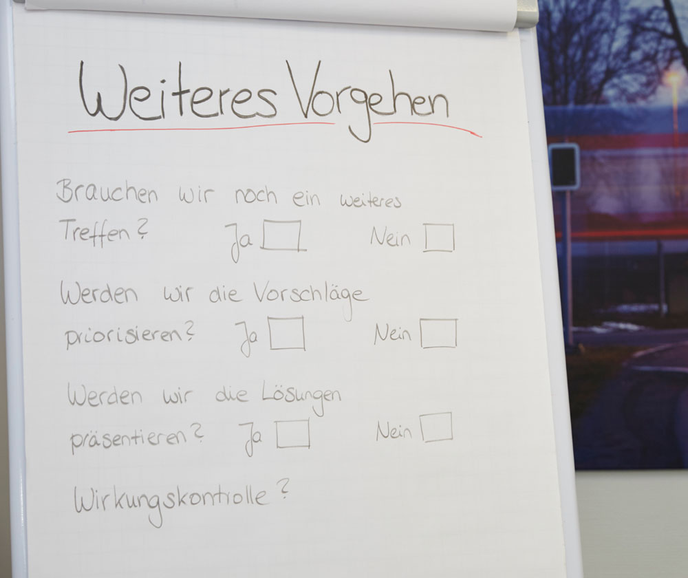 Die Frage der Wirkungskontrolle wird von der Moderatorin angesprochen. Woran wird man erkennen, dass die Umsetzung einer Lösungsidee erfolgreich war? Die Gruppe möchte die Frage zusammen mit dem Vorgesetzten besprechen. Gemeinsam spricht man sich dafür aus, vorzuschlagen, nach einem Jahr den Lösungsworkshop in der gleichen Form erneut durchzuführen. Zum Einstieg soll über die Wirkung und den Erfolg der jetzt vorgeschlagenen Maßnahmen diskutiert werden.