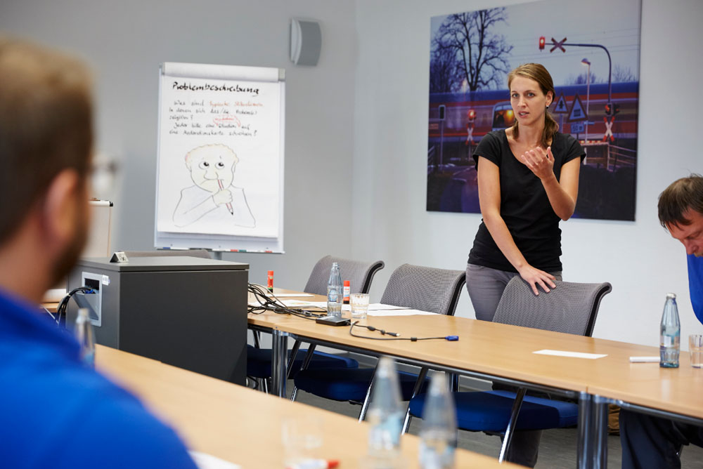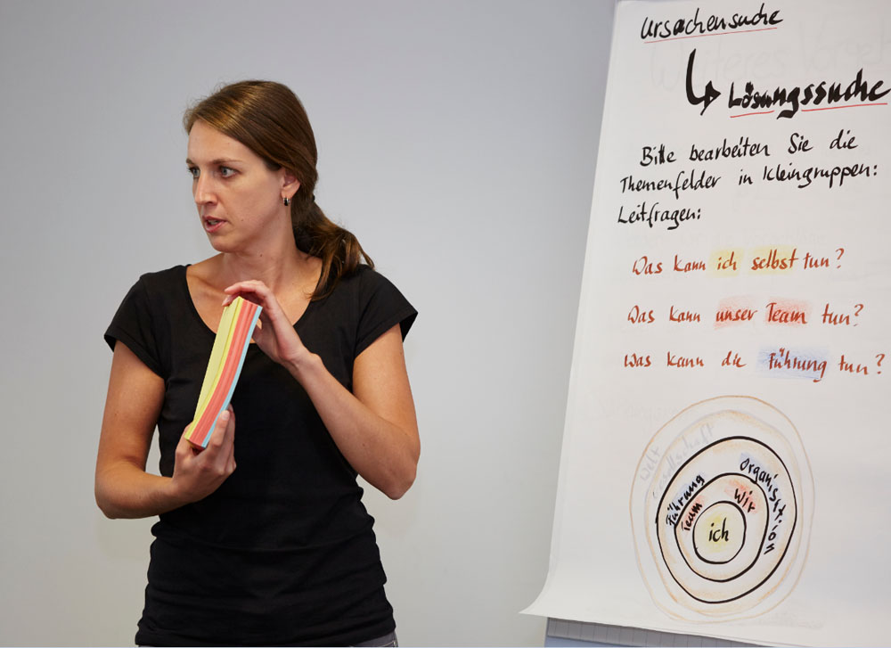 Die Moderatorin gibt die Anweisung, dass sich die Teilnehmer paarweise untereinander austauschen sollen, um möglichst zu jedem Schwerpunktthema eine typische Situation zu finden. Jedes Paar bekommt von ihr mehrere weiße Moderationskarten.