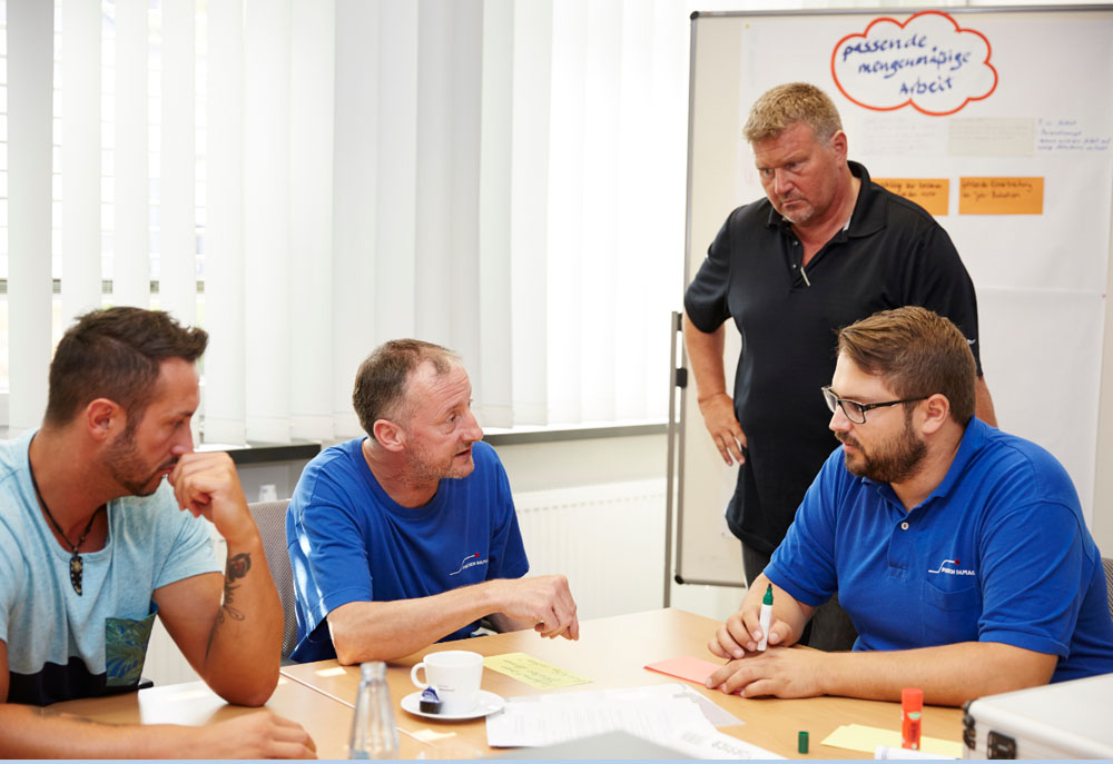 Die ersten Prozessschritte sind absolviert. In dem Betrieb wurde eine Online-Befragung mittels KFZA durchgeführt. Das Ergebnis legt eine tiefergehende Analyse nahe, obwohl keines der Schwerpunktthemen im "roten Bereich" ist. Mit Hilfe des Lösungsworkshops sollen Lösungen für die gestaltungsbedürftigen Themenfelder gefunden werden. Das Team wird zu dem Treffen eingeladen. Es findet während der Arbeitszeit statt. Die Moderation übernimmt eine Mitarbeiterin aus der Personalabteilung.
