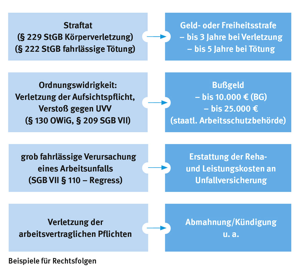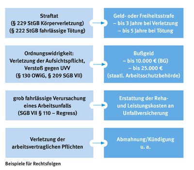 - Ordnungswidrigkeiten-rechtliche Folgen (Bußgeld), wenn die Aufsichtspflicht verletzt oder gegen berufsgenossenschaftliche Vorschriften verstoßen wurde, ohne dass es zu einem Unfall gekommen ist