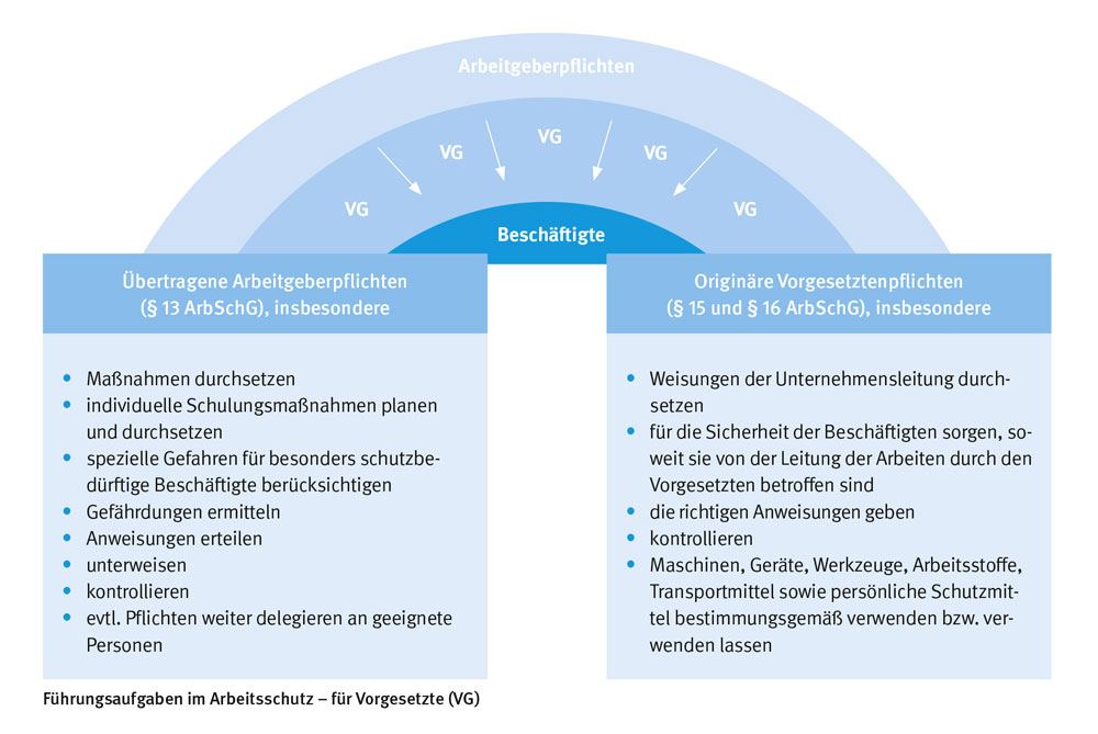 Alle Beschäftigten, also auch die Vorgesetzten, sind verpflichtet, bei ihrer Arbeit die Arbeitsschutzbestimmungen und die Weisungen des Arbeitgebers zu beachten und auch selbst für die Sicherheit und Gesundheit der Personen zu sorgen, die von ihren Handlungen und Unterlassungen bei der Arbeit betroffen sind. Vorgesetzte dürfen auch in ihrer Eigenschaft als Beschäftigte nichts tun oder unterlassen, was "ihre" Mitarbeiterinnen und Mitarbeiter in Gefahr bringen könnte. Also müssen sie vor allem die richtigen Anweisungen geben und die Arbeiten sicher organisieren. Das sind originäre Pflichten der Vorgesetzten, wenn auch abgeleitet aus ihrem besonderen Arbeitsauftrag.