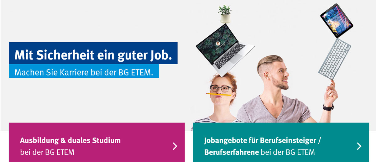 Bei der BG ETEM gibt es viele interessante Berufe für alle, die kommunikativ sind und gerne mit Menschen zu tun haben. Ihre Karriere bei der BG ETEM kann mit einer Ausbildung oder mit einem Dualen Studium beginnen. Wir freuen uns auch auf neue Kolleginnen und Kollegen mit Berufserfahrung.