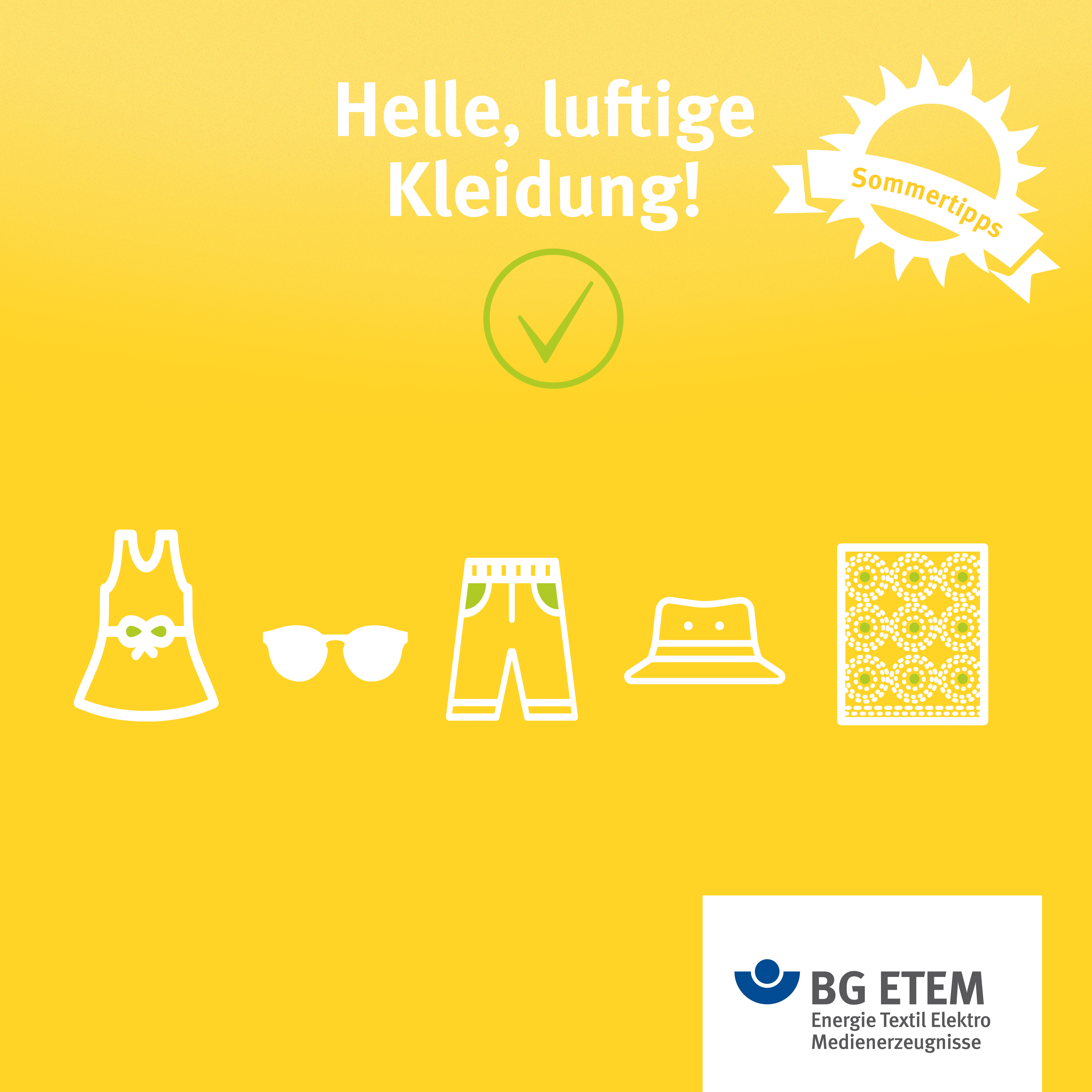 Achtet bei Hitze am besten auf helle und luftige Kleidung. Leicht und luftdurchlässig sollte sie sein und bei direkter Sonneneinstrahlung den Körper gut schützen. Kopfbedeckung, Sonnenbrille und Sonnencreme nicht vergessen!