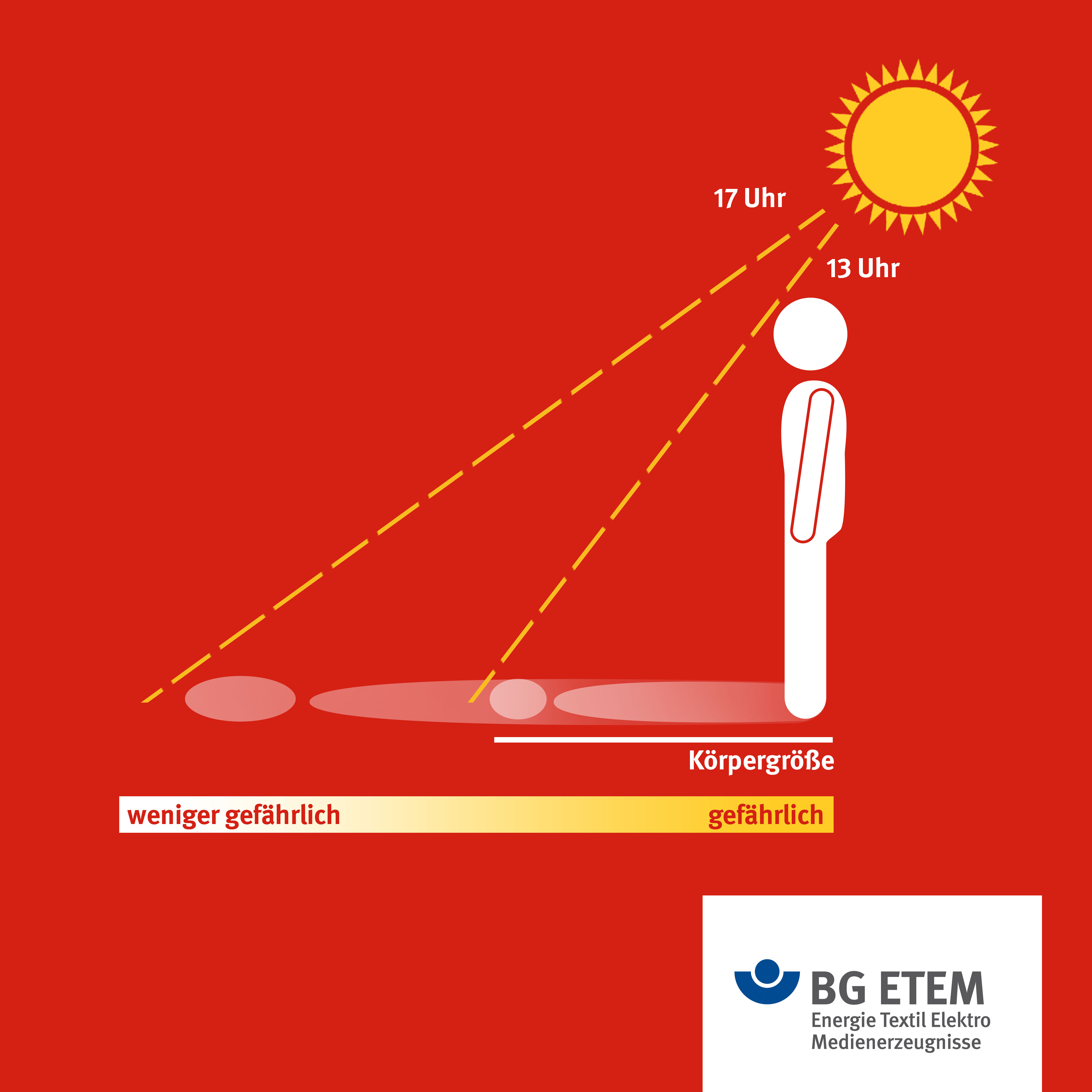 Für alle unter euch, die im Freien arbeiten: die Schattenregel. Ist der Schatten kleiner als die Körpergröße, ist die UV-Strahlung sehr hoch und arbeiten im Freien ohne Sonnenschutz gefährlich.