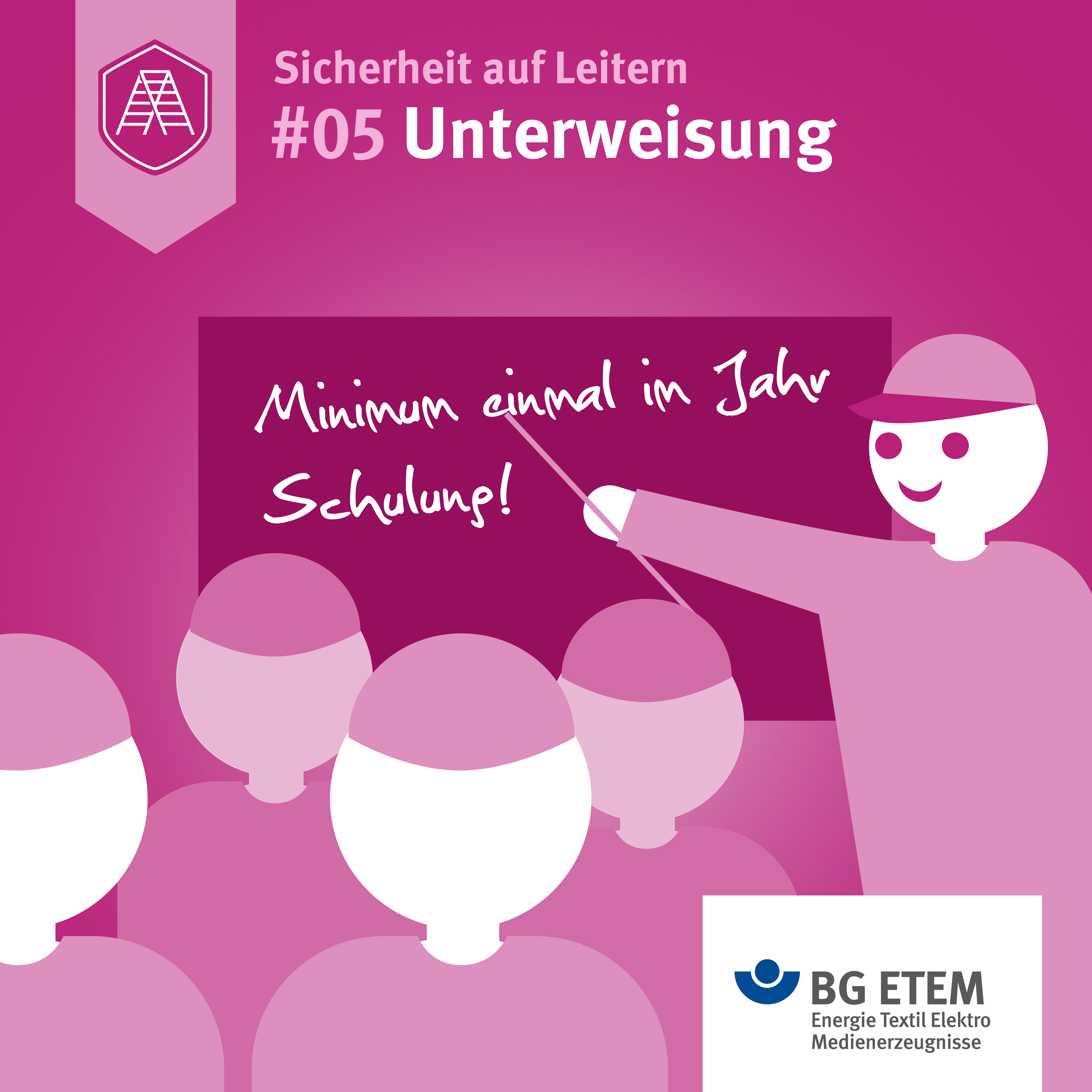 Leitern will gelernt sein: Eure Vorgesetzten unterweisen euch mindestens einmal im Jahr über die Sicherheitsvorkehrungen auf Leitern. Auch nach besonderen Anlässen z. B. beim Einsatz neuer Leiterbauarten oder nach Unfällen sollte eine Schulung erfolgen. Solche Unterweisungen beinhalten Hinweise zur bestimmungsgemäßen Nutzung, zur Bauart und zusätzlichen Gefährdungen (z. B. Witterungseinflüsse etc.).
