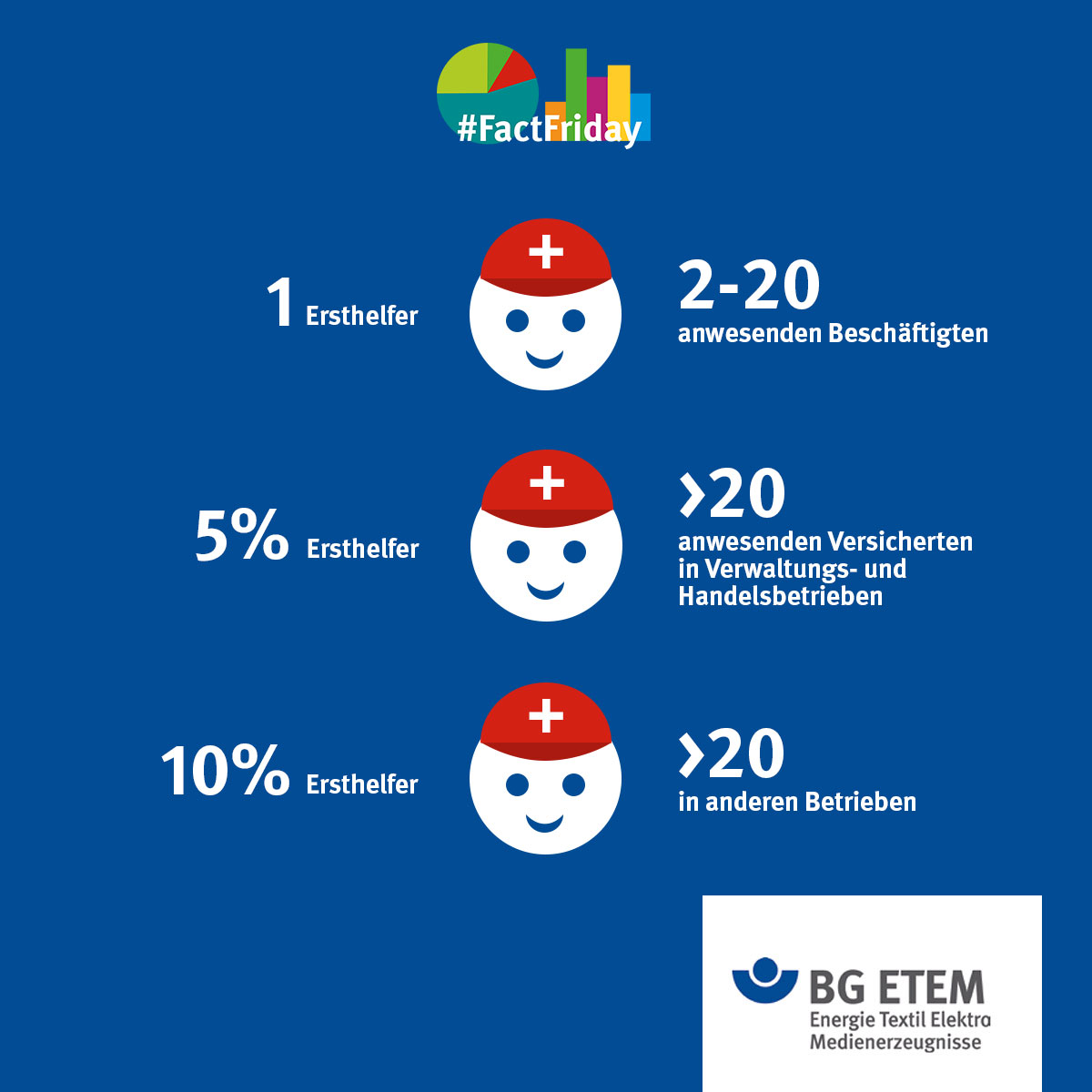 Fakt: jeder Betrieb mit 2-20 anwesenden Beschäftigten muss einen Ersthelfer haben. Bei mehr als 20 anwesenden Versicherten in Verwaltungs- und Handelsbetrieben müssen 5 Prozent der anwesenden Beschäftigten, in anderen Betrieben 10 Prozent der anwesenden Beschäftigten als Ersthelfer zur Verfügung stehen.