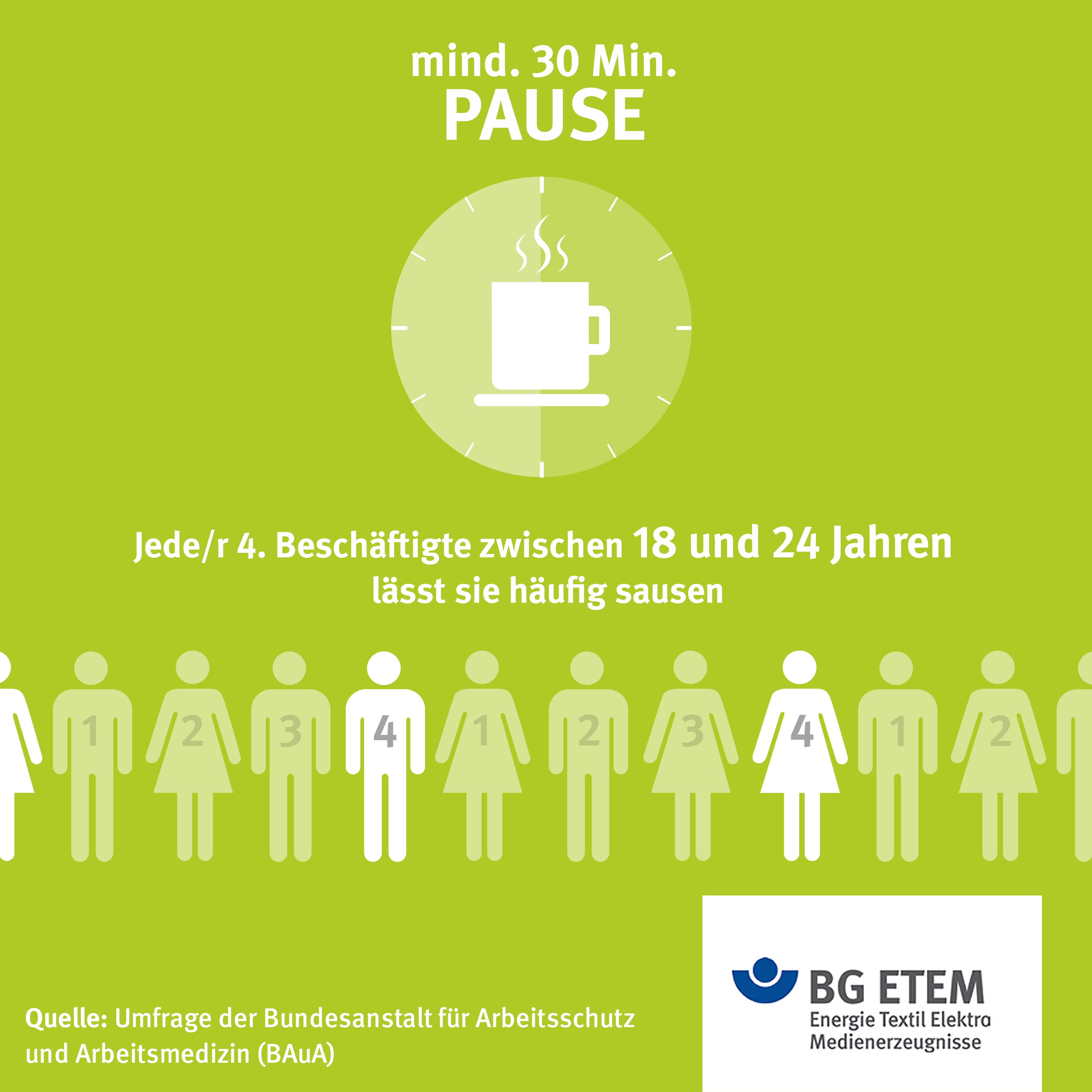 Laut einer Umfrage der Bundesanstalt für Arbeitsschutz und Arbeitsmedizin (BAuA) lässt jede/r vierte Beschäftigte zwischen 18 und 24 Jahren häufig die Pause sausen. Dabei sind die Ruhezeiten gesetzlich festgelegt und wer mehr als sechs Stunden täglich arbeitet, muss zwischendurch mindestens 30 Minuten Pause machen. Wie sieht das bei euch aus? Verzichtet ihr auch auf eure Pause, weil ihr sonst euer Arbeitspensum nicht schafft?