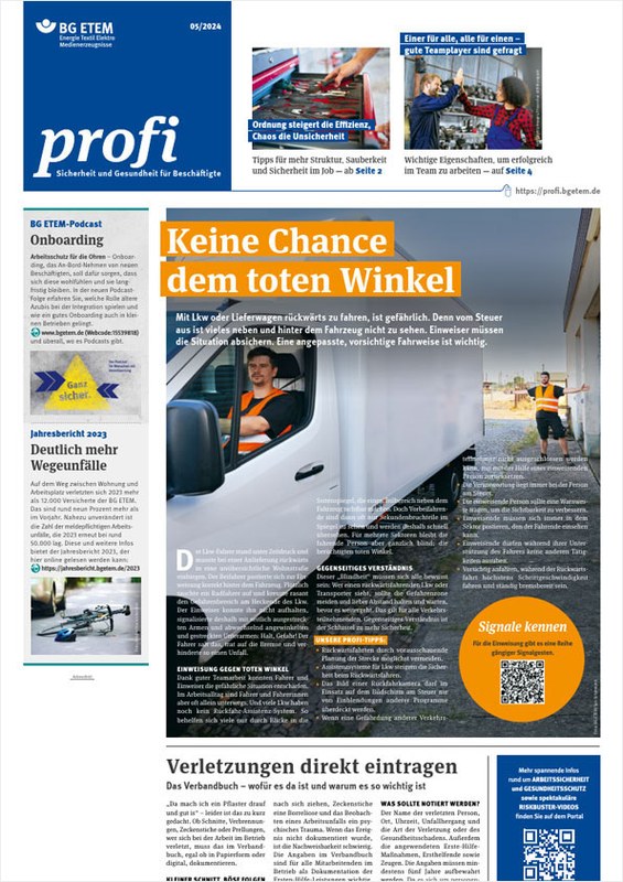 Mit einem Lkw oder Lieferwagen rückwärts zu fahren, birgt große Risiken. Ein Einweiser sorgt für sicheres Rangieren. Ordnung am Arbeitsplatz zu halten, senkt den Stress. "Profi" hält Ordnungs-Tipps bereit. Was einen guten Teamplayer auszeichnet und wie man seine Teamfähigkeiten verbessern kann, ist Thema der Ausgabe.