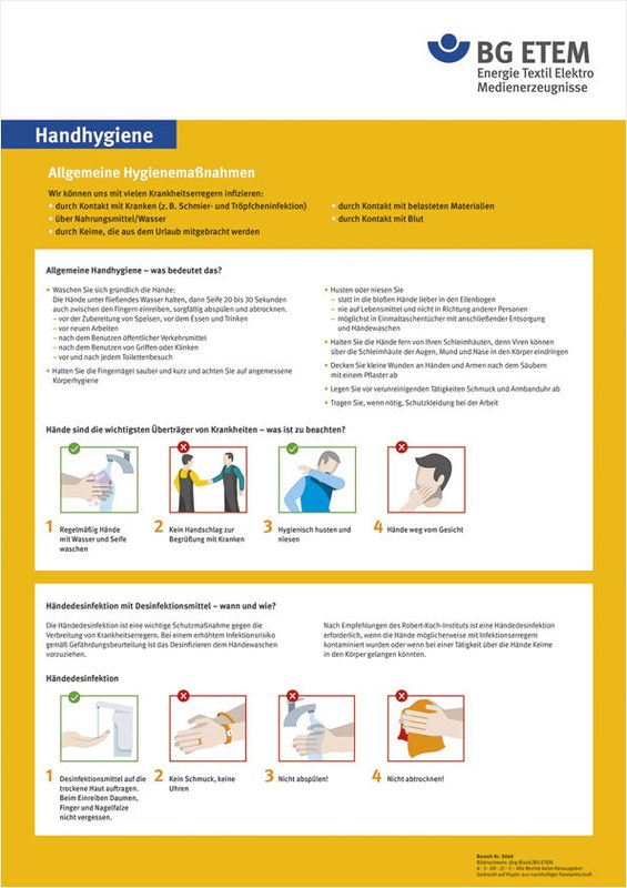 Wie wichtig Handhygiene ist, hat sich gerade mit Ausbruch der Corona-Pandemie gezeigt. Doch auch unabhängig davon und gerade mit Beginn der Herbstsaison gilt: Hygiene schützt - auch vor Erkältungskrankheiten. Wichtige Maßnahmen der Handhygiene fasst der neu aufgelegte Aushang der BG ETEM im Format DIN A3 plakativ zusammen: hilfreiche allgemeine Tipps, um die Hände als Überträger von Krankheiten auszuschalten, ebenso wie die Schritt-für-Schritt-Anleitung zur Durchführung der Händedesinfektion in Wort und Bild.