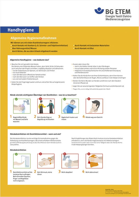 Mit Anbruch der kühleren Jahreszeit steigt die Zahl der Corona-Infektionen, zudem beginnt die Erkältungs- und Grippesaison. Die richtige Handhygiene hilft, einer Infektion vorzubeugen. Einfache Tipps stellt der Aushang zur Handhygiene der BG ETEM anschaulich in Wort und Bild zusammen, wie z. B. die Hände regelmäßig mit Wasser und Seife waschen, den Kopf in die Armbeuge halten beim Husten oder Niesen, nicht mit den Händen ins Gesicht fassen.