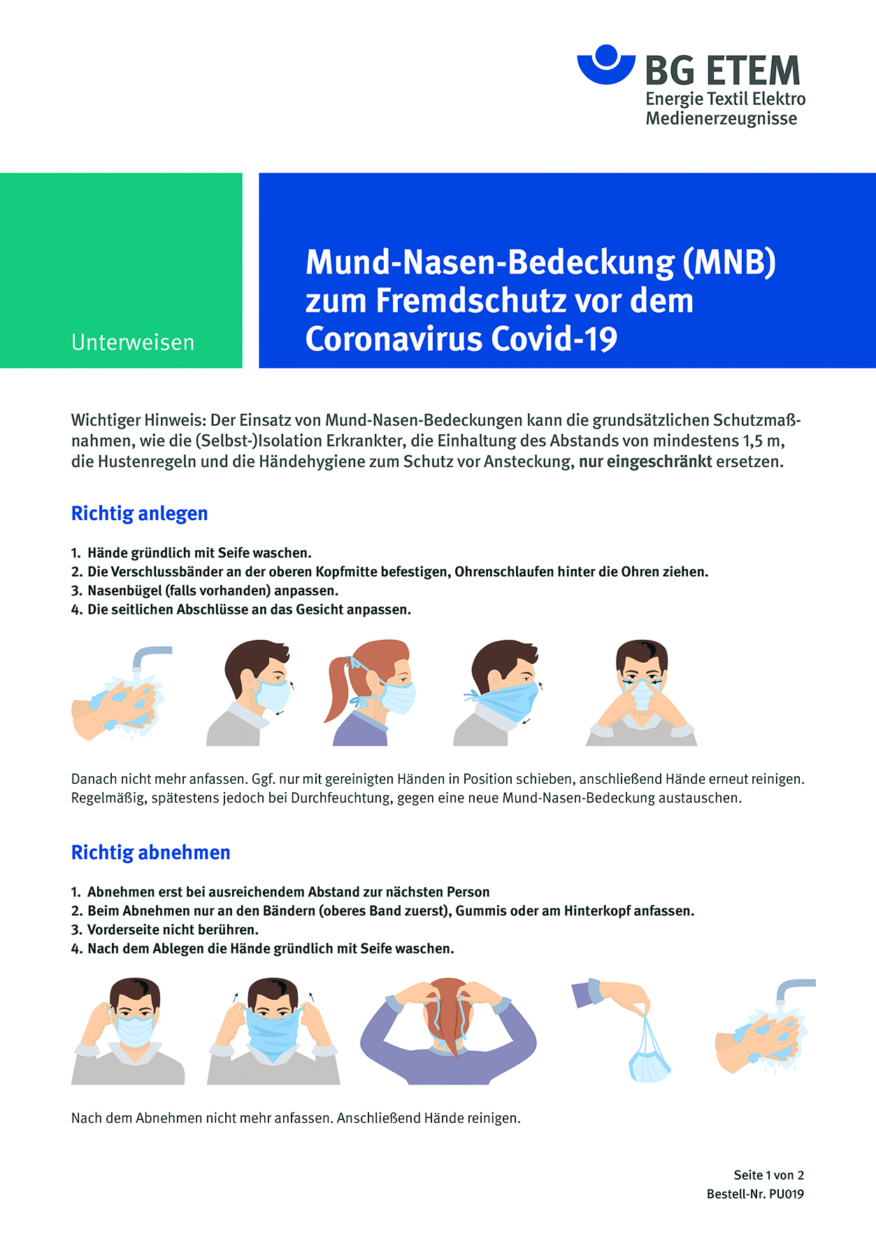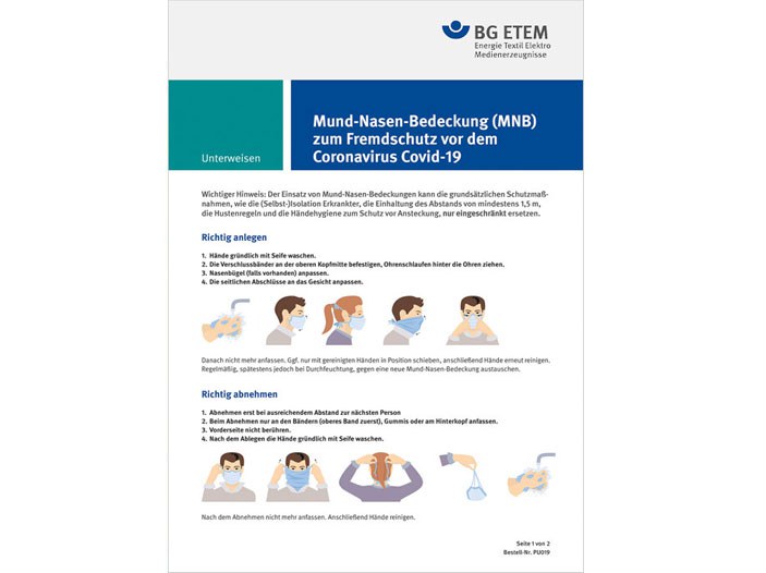 Zur Unterstützung der Unterweisung dient eine neue Kurz-Übersicht der BG ETEM; sie informiert über das richtige Anlegen, Abnehmen und Reinigen der Mund-Nasen-Bedeckung (MNB) zum Fremdschutz vor dem Coronavirus Covid-19. Die knapp gefassten Hinweise werden durch anschauliche Illustrationen ergänzt.