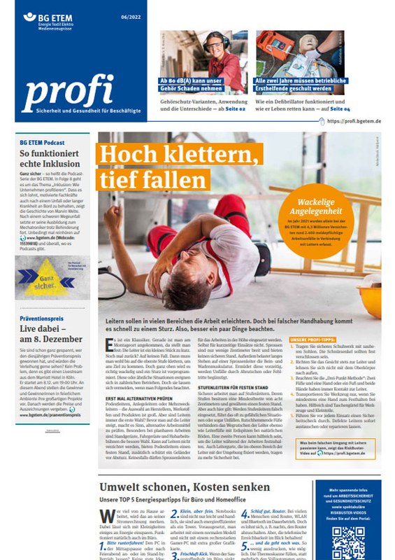 Leiterunfälle kommen immer noch viel zu oft vor. Wer Leitern nutzt, sollte schauen, ob die aufgelisteten Profi-Tipps im Arbeitsalltag angewendet werden. Gehörschutz in Lärmbereichen zu tragen ist enorm wichtig, weil die gesundheitlichen Schäden meist schleichend eintreten und unumkehrbar sind. Die Ausgabe gibt einen Überblick, worauf bei Gehörschutz geachtet werden sollte. In vielen Unternehmen gehört der automatisierte externe Defibrillator (AED) bereits zum Standard der Erste-Hilfe-Ausrüstung. Wichtig ist: Mit der richtigen Anwendung eines AEDs sollte sich jeder vorab vertraut machen. Lassen Sie sich zum Ersthelfer, zur Ersthelferin, ausbilden!