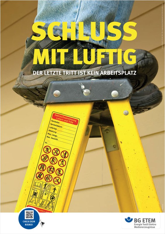 Die zwölf neuen Plakate der BG ETEM lenken den Blick auf Gefahren im Betrieb und auf dem Arbeitsweg: vom leichtfertigen Umgang mit schweren Lasten über einen waghalsigen Einsatz von Leitern bis hin zu Risiken für Radfahrende und andere Verkehrsteilnehmende.