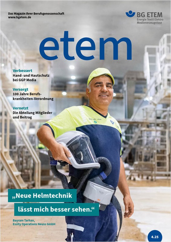 Augen- und Gesichtsschutz im Neusser Werk des Papierherstellers Essity, Hautschutz bei GGP Media und Mitgliederservice mit Mehrwert: Um all das und noch mehr geht es in "etem" 4.2025.