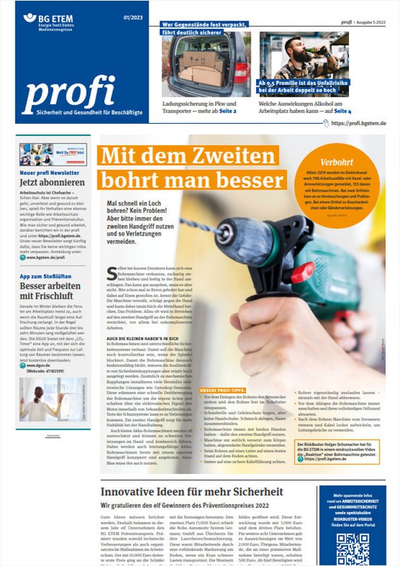 Wer wie ein Profi mit einer Bohrmaschine arbeitet, nutzt den zweiten Handgriff - ohne Ausnahme. Weitere Tipps, welche Fehler in der Handhabung unbedingt vermieden werden sollten, hält die neue Ausgabe der "profi" bereit. Ladung im Transporter oder PKW sicher zu verstauen, ist gar nicht schwer, wenn man ein paar Grundkenntnisse verinnerlicht und die richtigen Hilfsmittel einsetzt. Alkohol am Arbeitsplatz ist ein ernstes Thema, für Betroffene, aber auch für die Unternehmen.