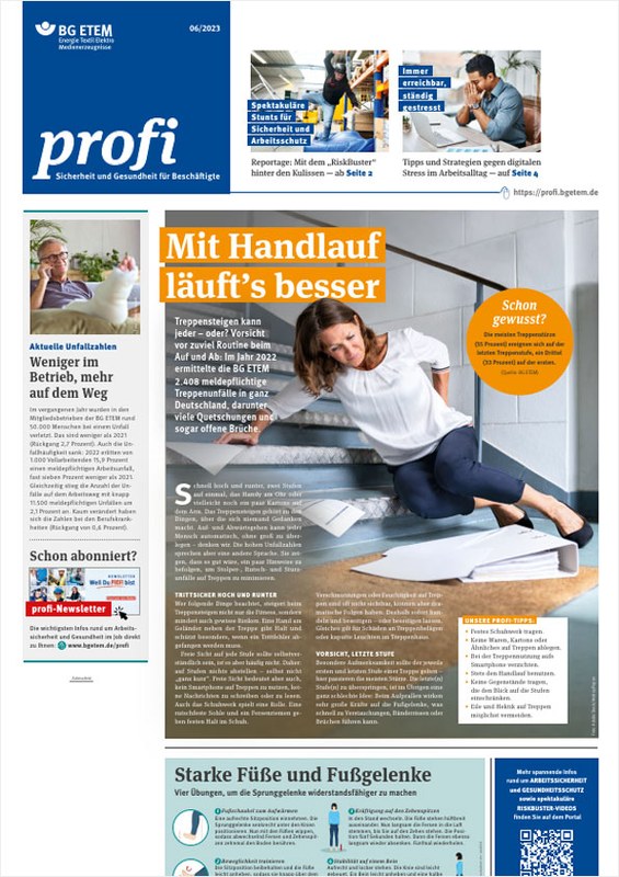 So simpel und wirkungsvoll: Auf Treppen eine Hand an den Handlauf, ist der beste Schutz vor Treppenunfällen. "profi" zeigt weitere, leicht vermeidbare Unfallgefahren auf Treppen. Holger Schumacher, BG ETEM RiskBuster, hat sich beim Video-Dreh zum Thema Leitern über die Schulter blicken lassen. Warum digitaler Stress zunimmt, erläutert Arbeitspsychologe Dr. Just Mields. Gezielte Pausen im Arbeitsalltag einzulegen, ist wichtig bei der Stressprävention. Die BG ETEM App "Kurzpausen" bietet dazu praktische Anleitungen.
