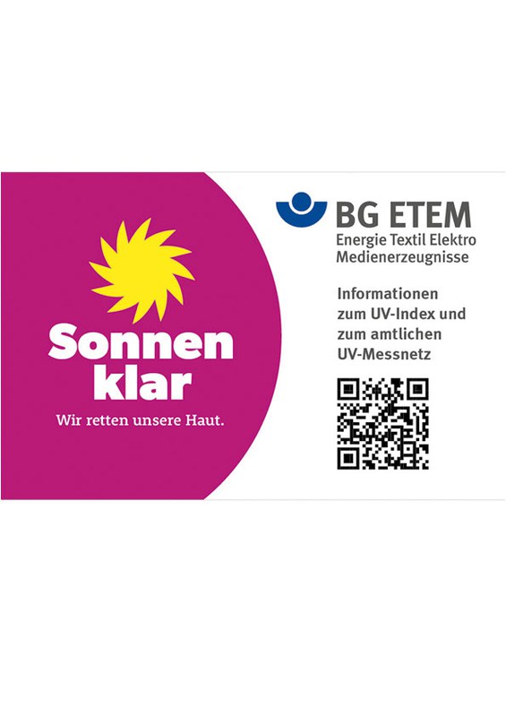 Die neue UV-Testkarte im Checkkartenformat der BG ETEM hilft, die UV-Belastung beim Arbeiten im Freien einzuschätzen: einfach die Karte für 30 Sekunden ins Tageslicht halten, der weiße Kreis verfärbt sich dann lila; die nun angezeigte Verfärbung mit der aufgedruckten Farbskala vergleichen und auf diese Weise den abgeschätzten UV-Index ermitteln. Je stärker sich die Kreisfläche lila verfärbt, desto höher ist die UV-Belastung.
