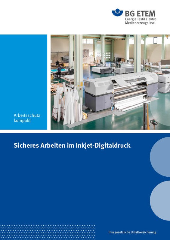 Das Angebot großformatiger Digitaldruckmaschinen wird immer vielfältiger. Die Broschüre informiert über Gefährdungen und Schutzmaßnahmen; ihr Ziel ist es, Hilfestellung zu geben. Es werden die wesentlichen Aspekte der Sicherheitstechnik berücksichtigt, z. B. im Hinblick auf die bewegten Maschinenteile, die chemischen Gefährdungen durch Farben, Tinten, Lösemittel sowie die Arbeitsplatzgestaltung, z. B. beim Schneiden, Lagern und Transportieren. Auch organisatorische Aspekte werden berücksichtigt.