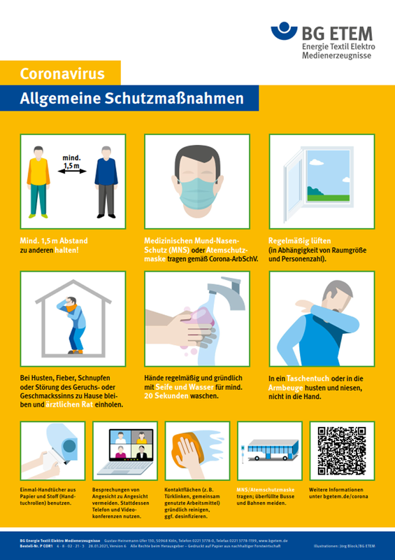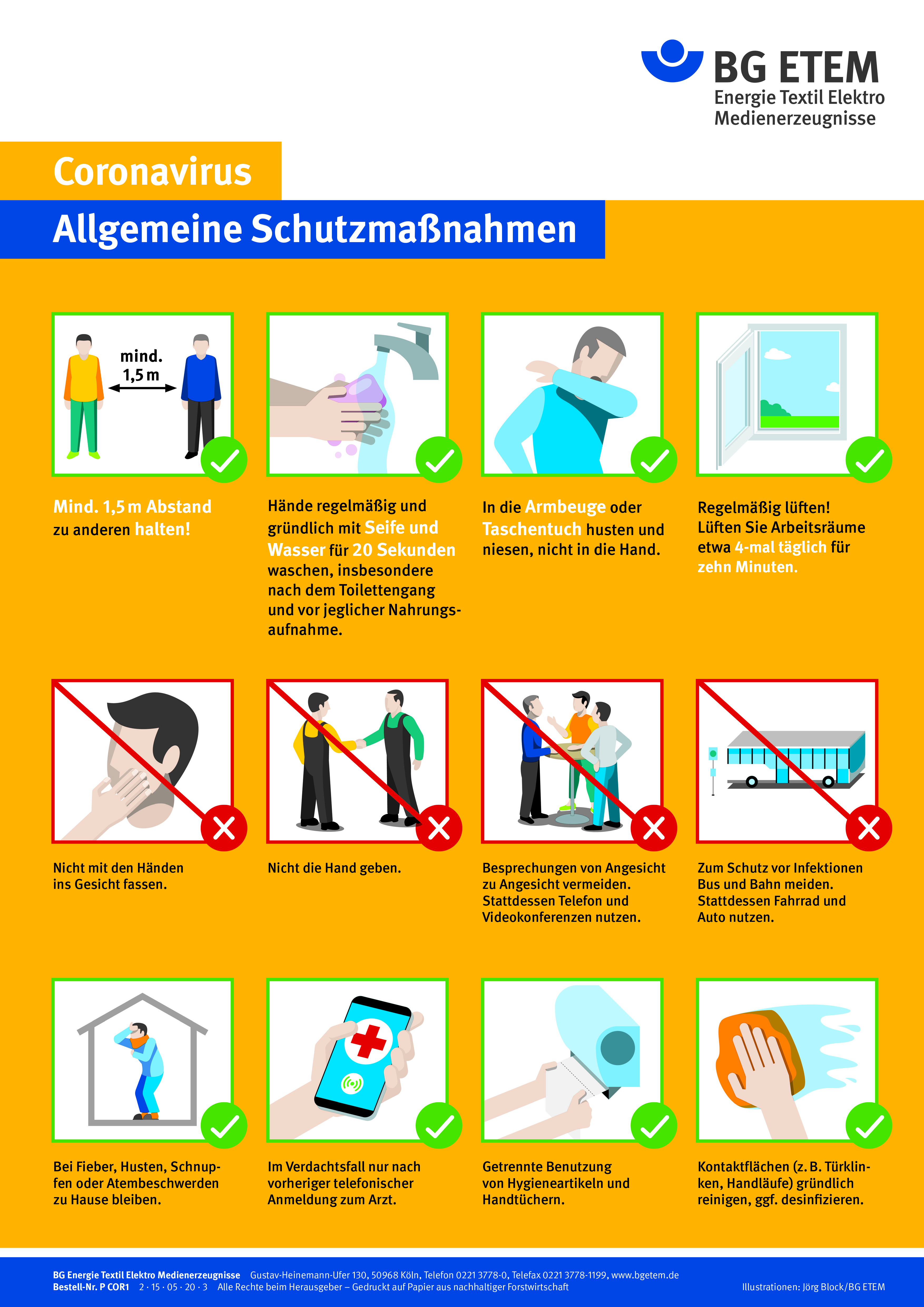 Das Plakat hat die Bestellnummer P COR1 und kann unter www.bgetem.de, Webcode M20135025 kostenlos als PDF aufgerufen oder als gedrucktes Exemplar kostenpflichtig bestellt werden.