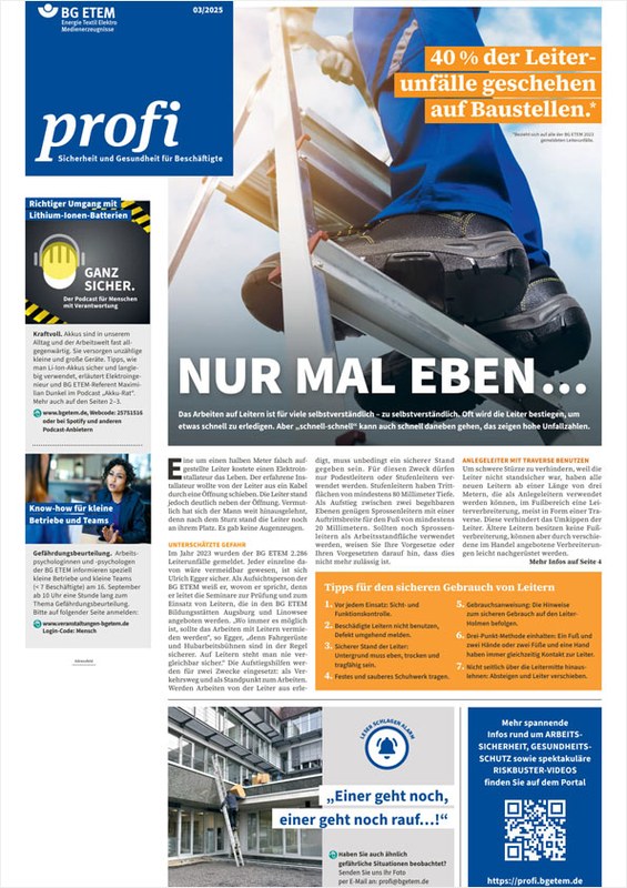 Es ist keine gute Idee: Mal eben auf eine Leiter steigen, um schnell etwas zu erledigen. In vielen Fällen geht das gehörig schief - die Zahl der Leiterunfälle spricht für sich. Allein im Jahr 2023 wurden der BG ETEM davon 2.286 gemeldet. Damit Leiternutzerinnen und -nutzer unversehrt herunterkommen, statt zu fallen: Handfeste Tipps für den sicheren Gebrauch von Leitern gibt es jetzt in der neuen "profi". Außerdem geht es um Lithium-Ionen-Batterien: Unsere Infografik zeigt übersichtlich und kompakt, wie man mit der richtigen Akku-Handhabung Geräte wie Bohrmaschinen oder Handys schützt - und sich selbst.