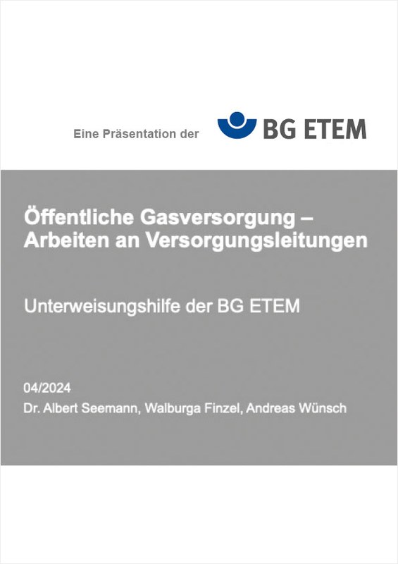 Die Unterweisungshilfe zum Arbeiten an Leitungen der Gasversorgung trägt die Bestellnummer PU024 und kann über www.bgetem.de, Webcode M24783872 aufgerufen werden.