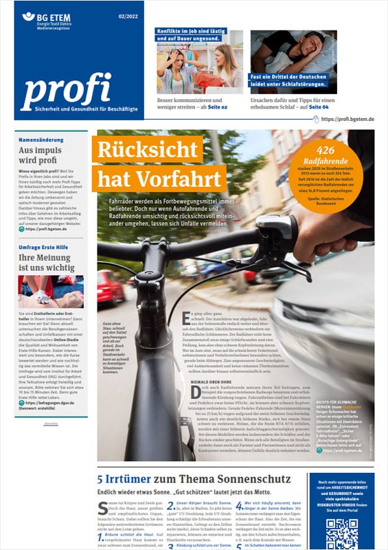 Im Betrieb kann richtiges Kommunizieren Unfälle verhindern helfen und das Betriebsklima maßgeblich bestimmen. Dass man sachlich kommunizieren sollte, weiß jeder. Die neue "profi" hält weitere Tipps bereit, um Missverständnisse gar nicht erst aufkommen zu lassen. Wer schlecht schläft, sollte zunächst prüfen, ob an alles gedacht wurde, was man selber vor dem Einschlafen für eine erholsame Nachtruhe tun kann.