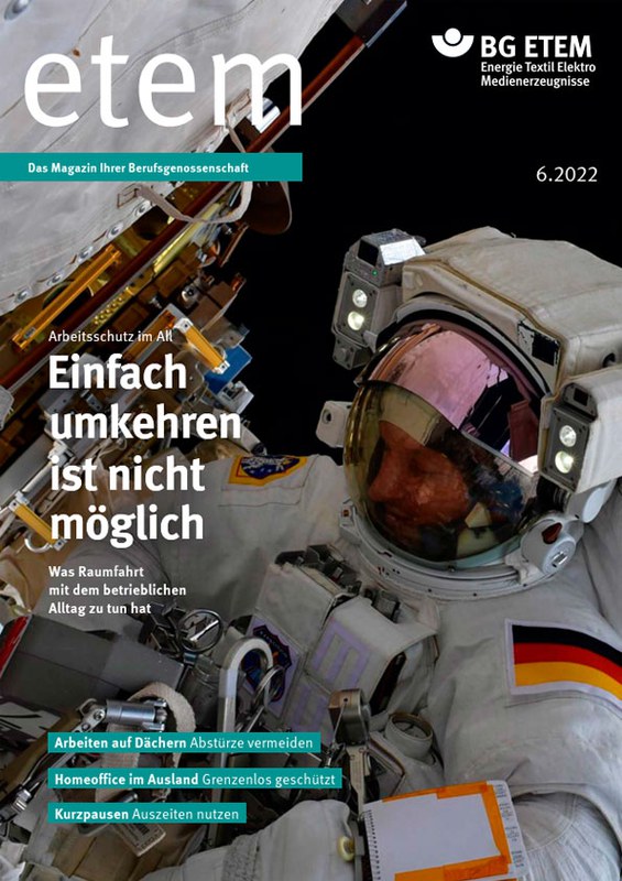 Bei Dacharbeiten geht es für Beschäftigte nicht ganz so hoch hinaus. Die Absturzgefahr ist allerdings hoch. Wir erklären, mit welchen Maßnahmen sie sich deutlich verringern lässt. Außerdem widmet sich Ausgabe 6 von "etem" dem Thema Pausen - denn wer schwer arbeitet, muss Auszeiten einlegen, um leistungsfähig zu bleiben.
