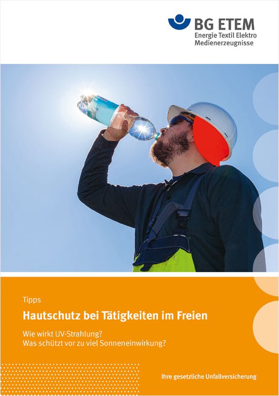(07.06.2021) Wer überwiegend oder zeitweise im Freien arbeitet, ist verstärkt der Sonne ausgesetzt. Wie kann man sich wirksam vor zu viel Sonneneinwirkung schützen? Wie wirkt UV-Strahlung? Was hilft, eventuelle Hautveränderungen frühzeitig zu erkennen? Darüber informiert kurz und prägnant das Faltblatt "Hautschutz bei Tätigkeiten im Freien", das die BG ETEM in aktualisierter Form neu aufgelegt hat.