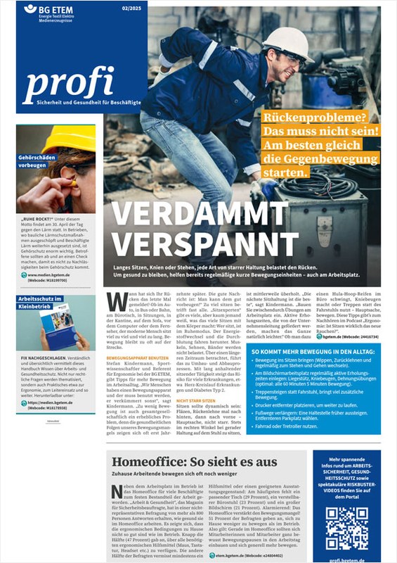 Langes Sitzen, Knien oder Stehen, jede Art von starrer Haltung belastet den Rücken. Regelmäßige kurze Bewegungseinheiten - auch am Arbeitsplatz - schaffen Abhilfe. Ein Übersichtsbild fasst zusammen, wann Beschäftigte auf Wegen von und zur Arbeit geschützt sind. Wir stellen außerdem eine praktische Transport-Lösung vor, die beim Präventionspreis ausgezeichnet wurde.