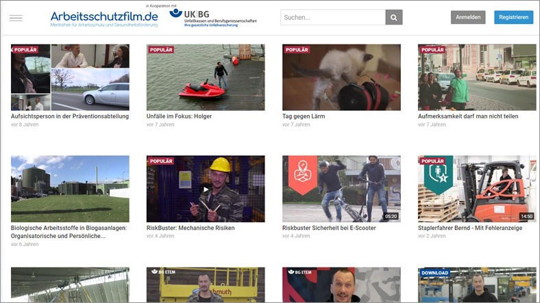 Arbeitsschutzfilm.de bündelt Arbeitsschutzfilme aus allen Branchen. Die Filme dienen der betrieblichen Unterweisung im Arbeitsschutz. Seit über 12 Jahren können Interessierte unter www.arbeitsschutzfilm.de unter aktuell 800 Filmen nach dem passenden Video suchen. Der Zugang zur Mediathek ist kostenfrei.