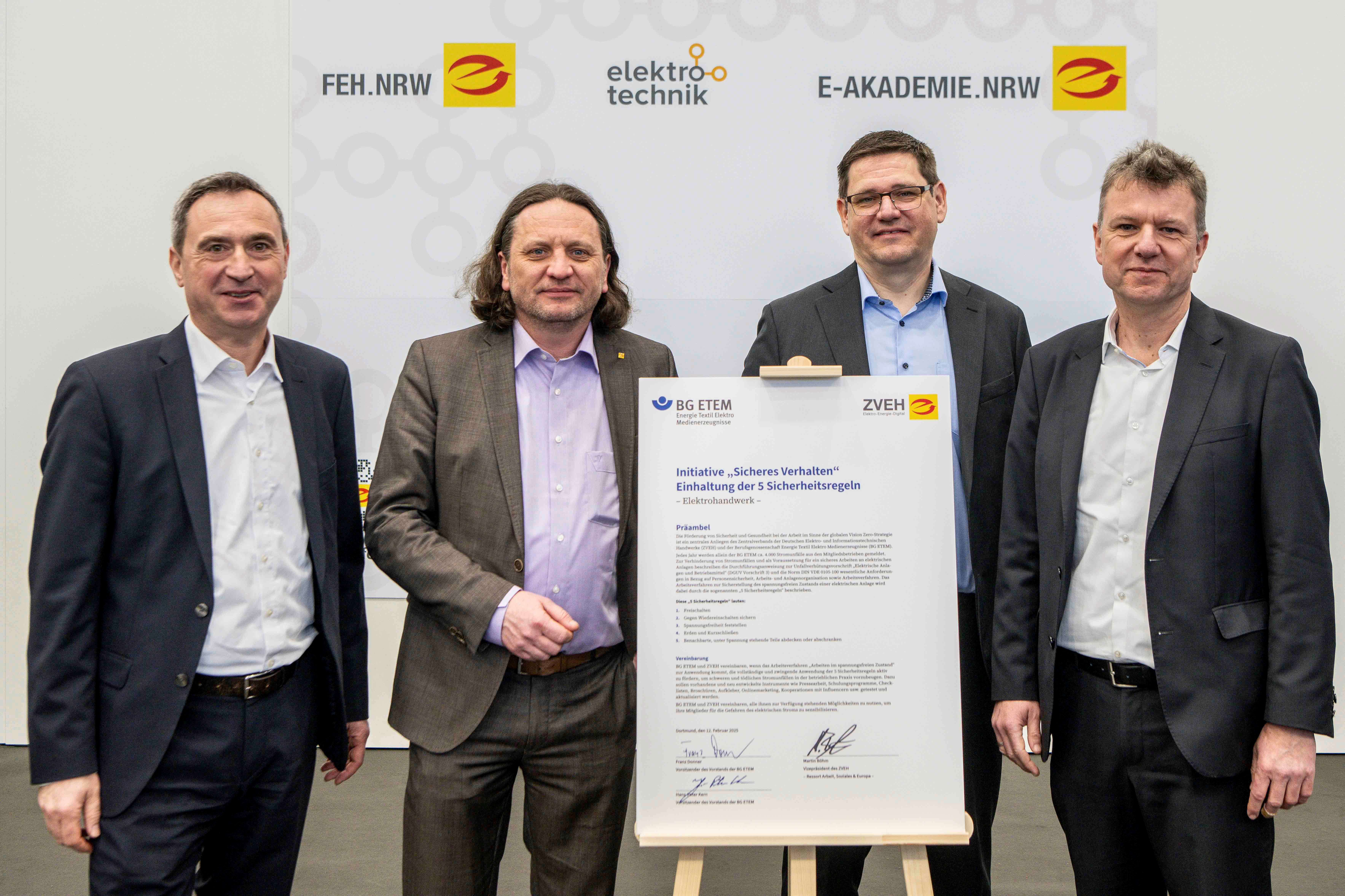 Rund 4.000 Stromunfälle ereignen sich jedes Jahr. Das wollen der Zentralverband der Deutschen Elektro- und Informationstechnischen Handwerke (ZVEH) und die Berufsgenossenschaft Energie Textil Elektro Medienerzeugnisse (BG ETEM) ändern. Dazu haben beide am 12. Februar auf der Messe elektrotechnik in Dortmund eine Branchenvereinbarung geschlossen. Auf dem Bild von links nach rechts: Frank Göller, BG ETEM, Martin Böhm, ZVEH, Stefan Ehinger, ZVEH, Jörg Botti, BG ETEM