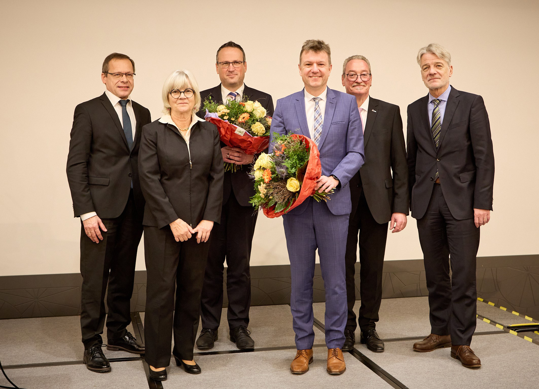 Die BG ETEM bekommt zum 1. Juni 2023 eine neue, schlankere Verwaltungsspitze. Die Weichen dafür hat die Vertreterversammlung der Berufsgenossenschaft Energie Textil Elektro Medienerzeugnisse (BG ETEM) in ihrer Sitzung am 9. Dezember 2022 in Köln gestellt. Im Bild v.l.n.r.: Johannes Tichi (Vorsitzender der Geschäftsführung), Karin Jung (Vorsitzende der Vertreterversammlung), Marco Wetzel (ab 1.6.2023 Stellvertretender Hauptgeschäftsführer), Jörg Botti (Mitglied der Geschäftsführung, ab 1.6.2023 Hauptgeschäftsführer), Hans-Peter Kern (Stellvertretender Vorsitzender des Vorstands), Jobst Kleineberg (Stellvertretender Vorsitzender der Vertreterversammlung). Die Verwendung dieses Bildes ist nur in Verbindung mit der Pressemitteilung und nicht zu anderen Zwecken gestattet. Bild: Tilmann Lothspeich