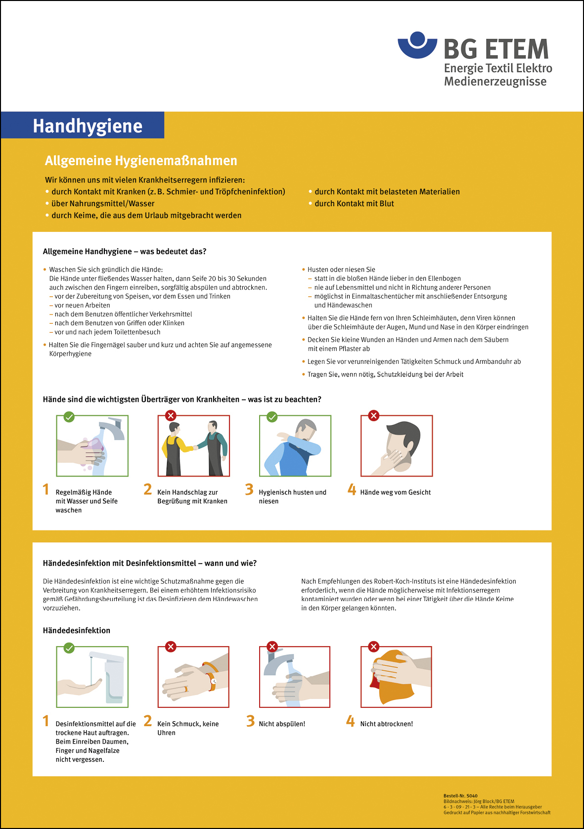 Mit Anbruch der kühleren Jahreszeit steigt die Zahl der Corona-Infektionen, zudem beginnt die Erkältungs- und Grippesaison. Die richtige Handhygiene hilft, einer Infektion vorzubeugen. Einfache Tipps stellt der Aushang zur Handhygiene der BG ETEM anschaulich in Wort und Bild zusammen, wie z. B. die Hände regelmäßig mit Wasser und Seife waschen, den Kopf in die Armbeuge halten beim Husten oder Niesen, nicht mit den Händen ins Gesicht fassen. Die Verwendung dieses Bildes ist nur in Verbindung mit der Medienankündigung und nicht zu anderen Zwecken gestattet.