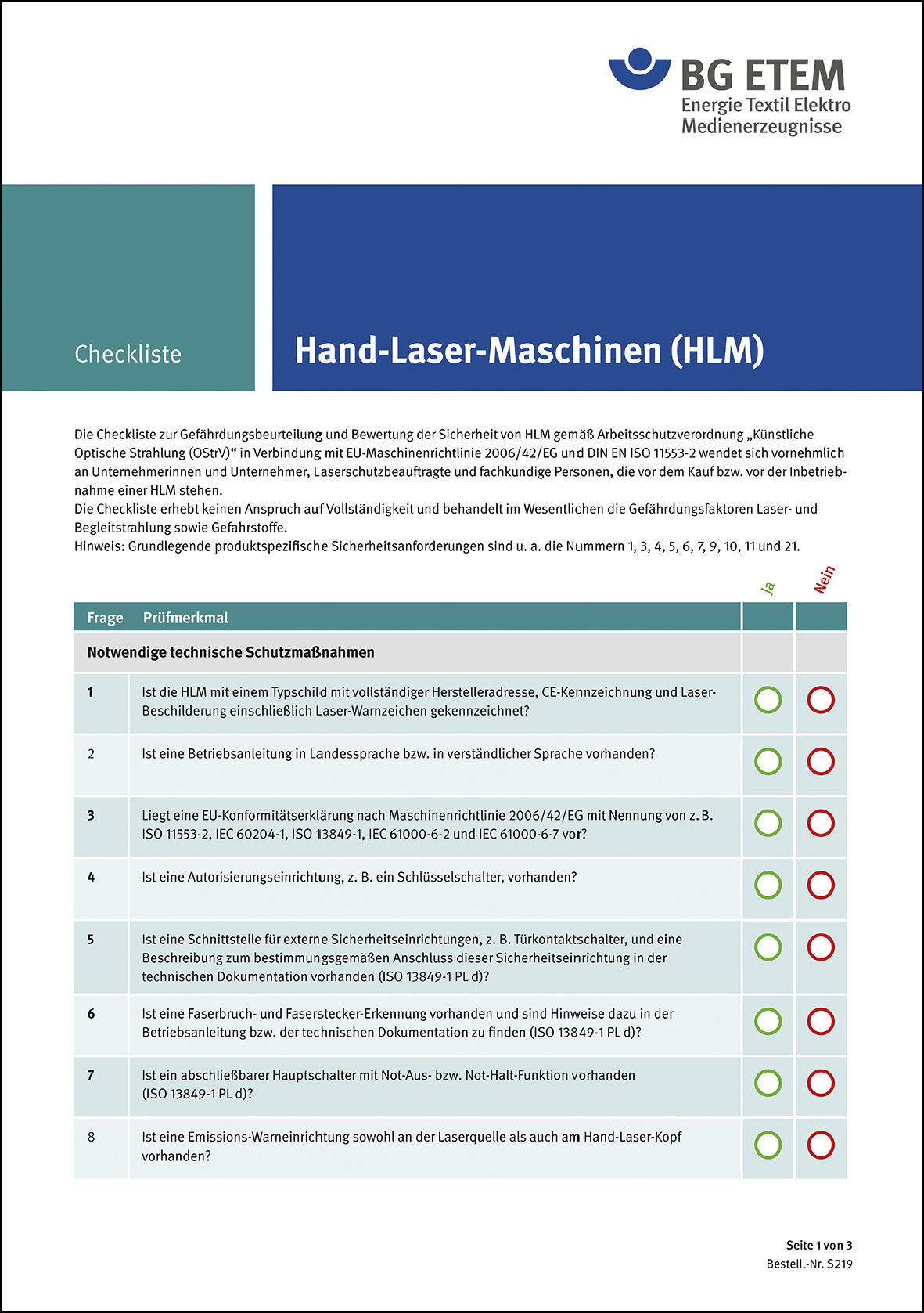 Die neue Checkliste "Hand-Laser-Maschinen" richtet sich vornehmlich an die Unternehmensleitung sowie an Laserschutzbeauftragte und fachkundige Personen, die vor dem Kauf bzw. der Inbetriebnahme einer solchen Maschine stehen. Sie behandelt im Wesentlichen die Gefährdungsfaktoren Laser- und Begleitstrahlung sowie Gefahrstoffe und geht auf notwendige technische, organisatorische und persönliche Schutzmaßnahmen ein.
