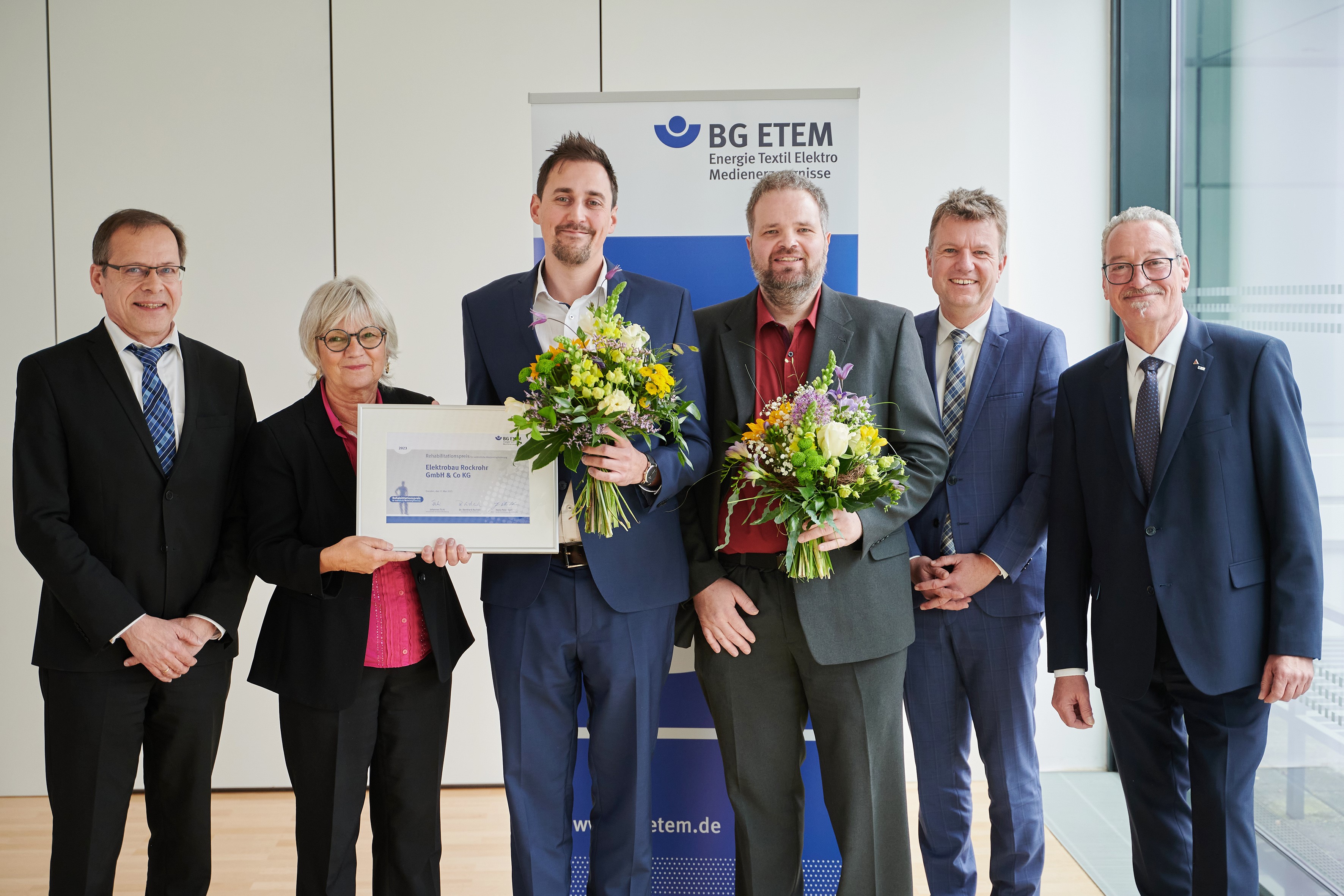 Die Elektrobau Rockrohr GmbH + Co. KG erhält in diesem Jahr den Rehabilitationspreis für vorbildliche Wiedereingliederung der Berufsgenossenschaft Energie Textil Elektro Medienerzeugnisse (BG ETEM). Auf dem Bild von links: Johannes Tichi, Vorsitzender der Geschäftsführung; Karin Jung, Vorsitzende der Vertreterversammlung; Benjamin Niebler, Elektrobau Rockrohr GmbH + Co. KG; Matthias Greiner, Elektrobau Rockrohr GmbH + Co. KG; Jörg Botti, Mitglied der Geschäftsführung; Hans-Peter Kern, Vorsitzender des Vorstands. (Bild: Stephan Floss)