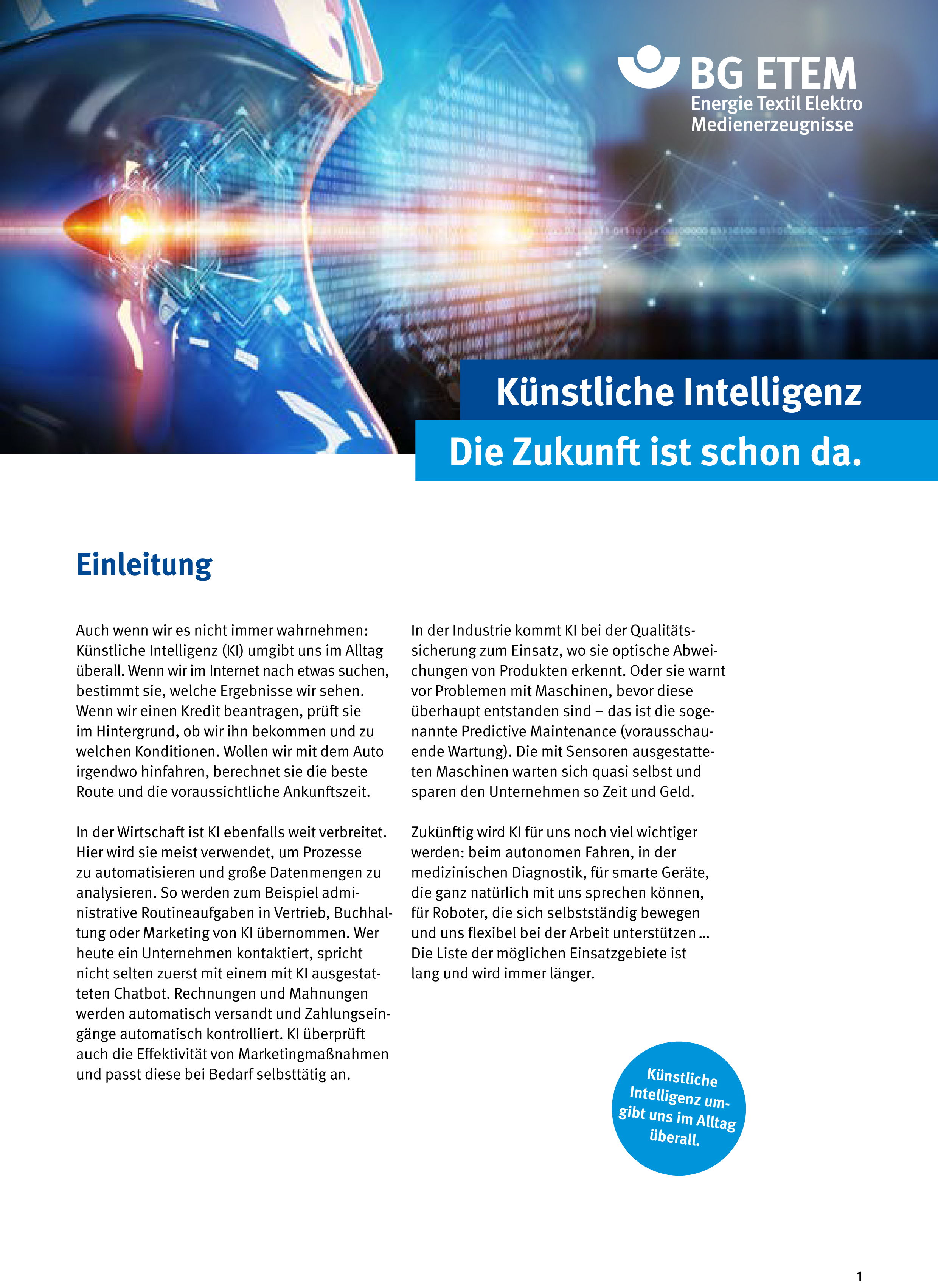 KI ist in aller Munde und gilt auch in der gesetzlichen Unfallversicherung als Schlüsselthema der Digitalisierung. Bei der BG ETEM sind inzwischen zwei KI-Anwendungen im produktiven Einsatz. Eine Dritte ist in der Entwicklung. Das Whitepaper "Künstliche Intelligenz - Die Zukunft ist schon da" wurde deshalb aktualisiert.