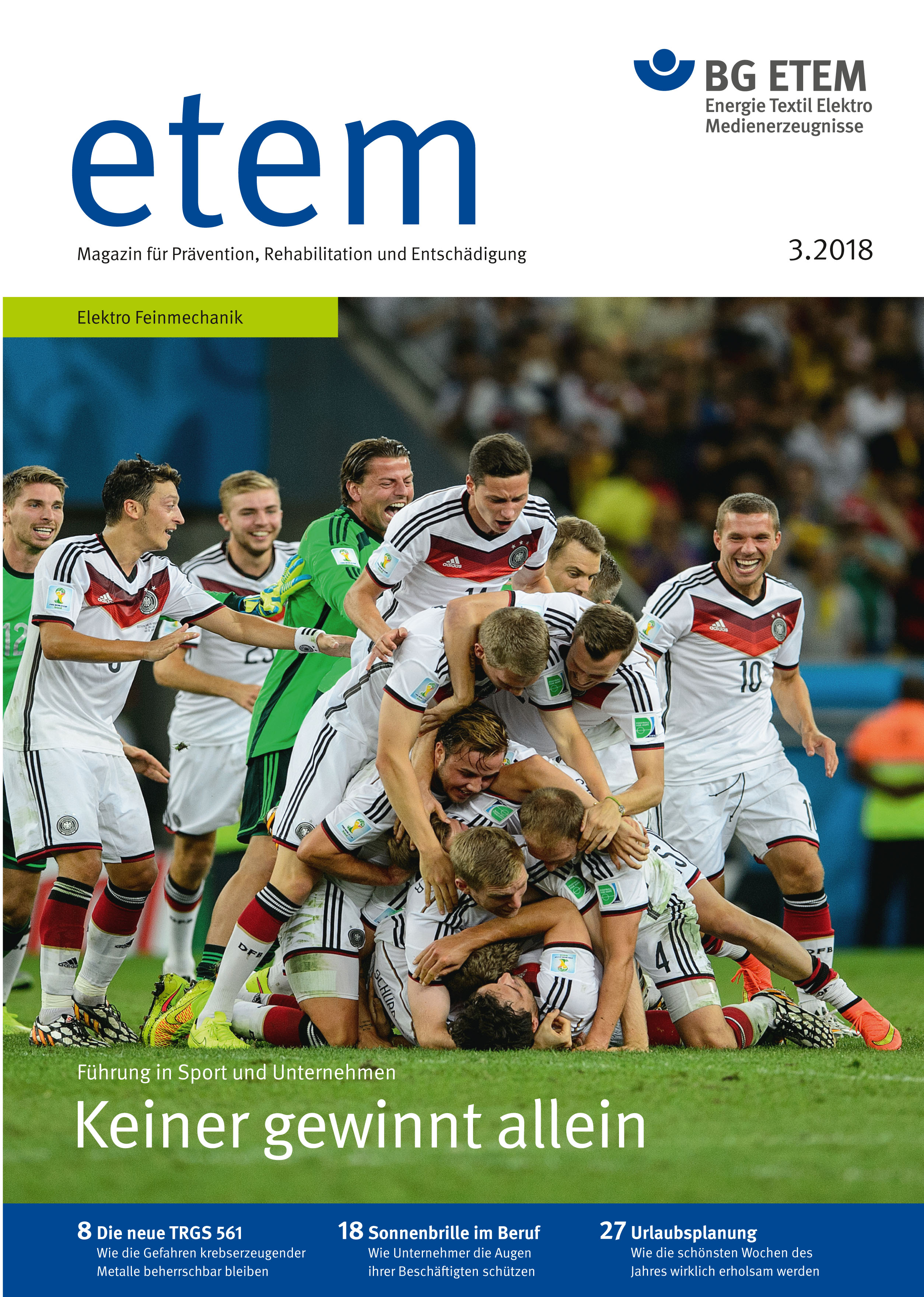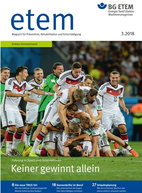 (Köln, 02.07.2018) Sportler und Beschäftigte in Unternehmen arbeiten dann gut und erfolgreich, wenn Trainer oder Führungskräfte sie richtig motivieren. Der Sportpsychologe Prof. Hans-Dieter Hermann berät seit 25 Jahren Unternehmen, seit 2004 auch die deutsche Fußball-Nationalelf. Seine These: Nur gute Führung bringt auch langfristig Erfolg. Das komplette Interview mit ihm rund um Jogi Löws Team ist in der aktuellen Ausgabe von etem 03/2018 - Magazin für Prävention, Rehabilitation und Entschädigung der Berufsgenossenschaft Energie Textil Elektro Medienerzeugnisse (BG ETEM) erschienen.