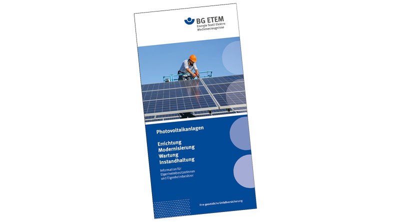Das neue Faltblatt "Photovoltaikanlagen: Errichtung - Modernisierung - Wartung - Instandhaltung" der BG ETEM weist knapp gefasst auf wichtige Punkte hin und erläutert in Kürze wesentliche Aspekte der Arbeitssicherheit für die Ausführung der Arbeiten.
