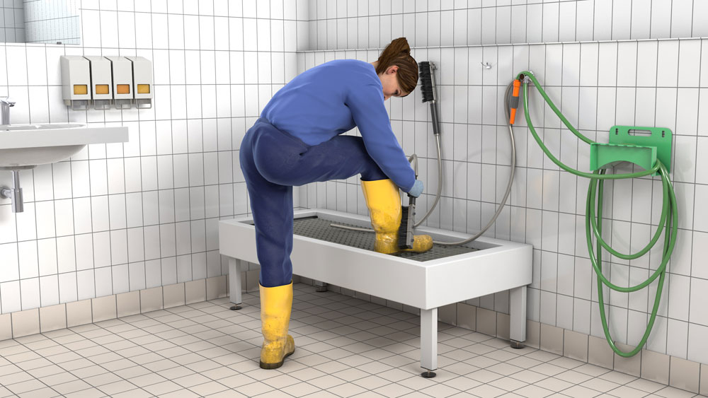 © H.ZWEI.S Werbeagentur GmbH-DGUV. Die Stiefelwaschanlage sorgt dafür, dass Beschäftigte den Schmutz nicht in die betrieblichen Räume tragen.