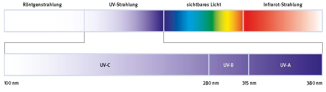 UV-Strahlung als Teil des elektromagnetischen LichtspektrumsQuelle: Broschüre "UV-Trocknung", BG_205_DP, Seite 11https://karriere.bgetem.de/portal/redaktion/arbeitssicherheit-gesundheitsschutz/dokumente-und-dateien/themen-von-a-z/strahlung-optische/uv-strahlung-als-teil-des-elektromagnetischen-lichtspektrums/viewhttps://karriere.bgetem.de/portal/redaktion/arbeitssicherheit-gesundheitsschutz/dokumente-und-dateien/themen-von-a-z/strahlung-optische/uv-strahlung-als-teil-des-elektromagnetischen-lichtspektrums/@@download/image/UV-Strahlung als Teil des elektromagnetischen Lichtspektrums.jpg